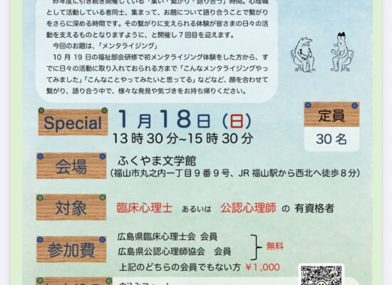 今日は、昨年から入らせてもらっている広島県公認心理師協会の研修会に参加してきました。 土日の研究会や勉強会が多く、さらに広島市である事も多くて、なかなか参加出来ないのですが、 福山市で開催され、横繋がりの連携を持つことで、もっとご相談者のためになる動きが出来るのではと、 今日は仕事の合間をぬって参加してきました。 ”メンタライジング”という、クライエントさんに寄り添う手法についての発表会でした。 ……(続きを読む)